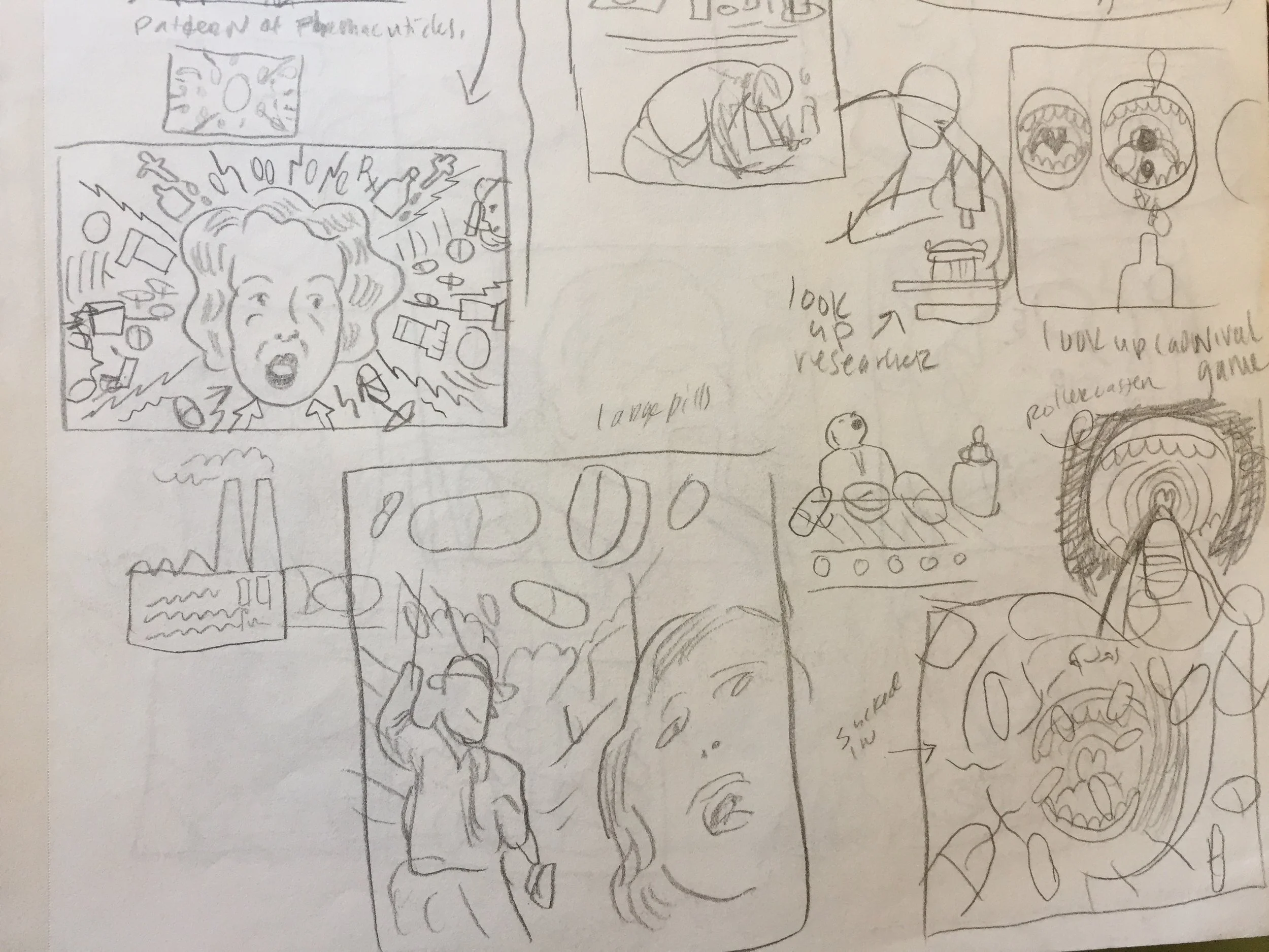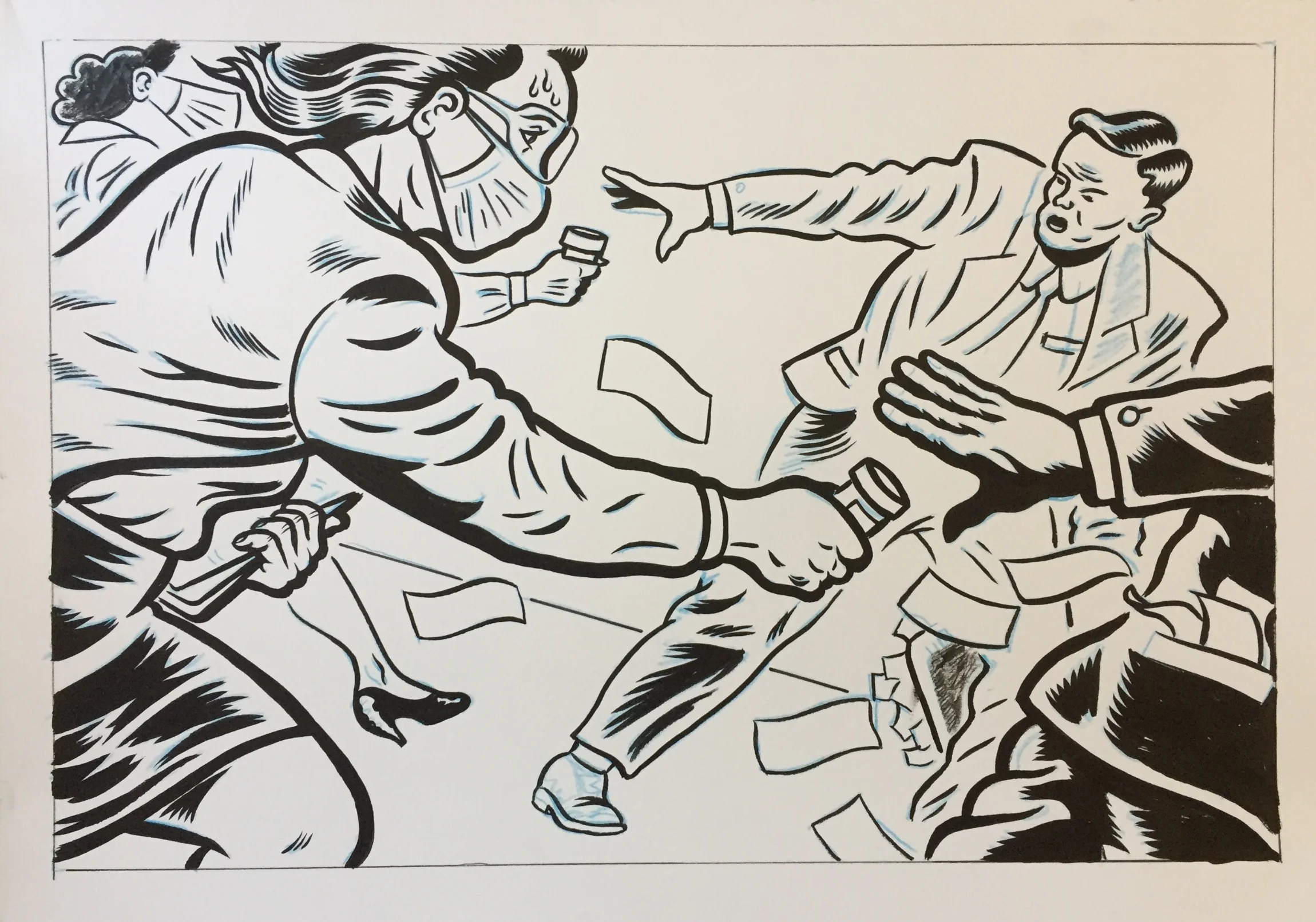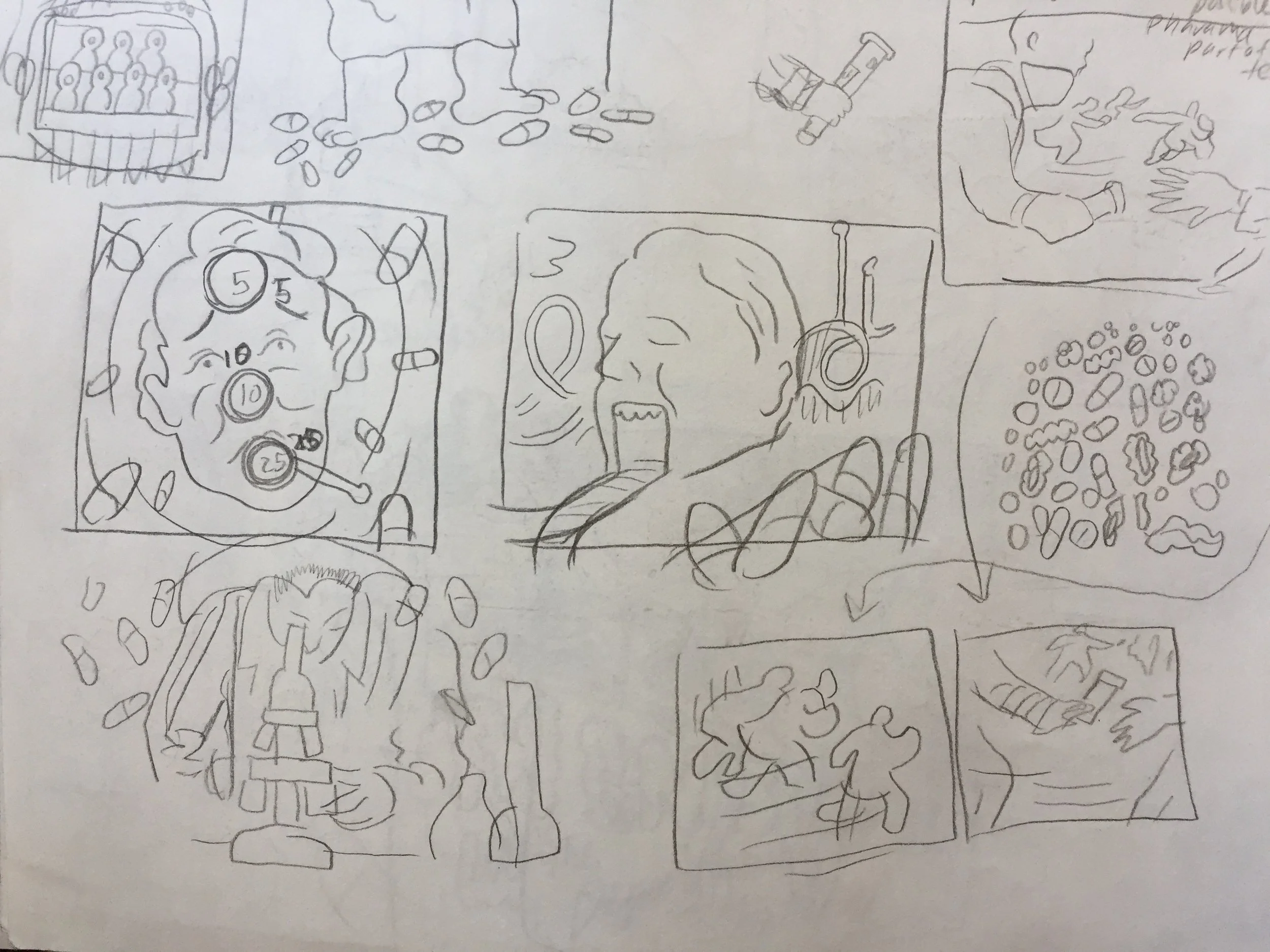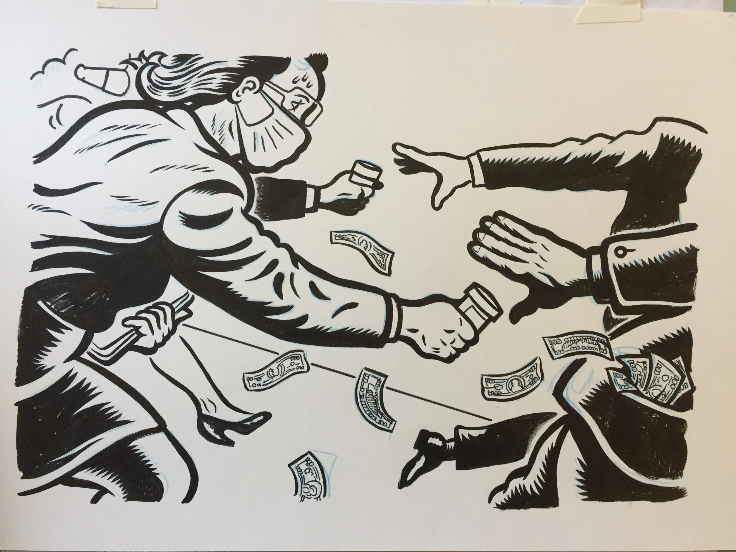 After I did my first pass inking the whole piece, I began coloring the image. Unfortunately the composition suddenly felt unfocused and I needed to make big changes which is a lot harder at this stage. What was the problem? The main focus of the image (the pill bottle handoff) was getting lost, and the man in the background was taking too much attention away from this. Also, look how ugly he is; it's distracting. We need to refocus on the woman and her sweaty brow. I needed to get his face out of frame and make some space around the pill bottle. I also felt like some bursting lines could draw even more attention to the bottle. I added a lot more black around the image to give it weight. What is a successful illustration? To me, it is an image that can direct the eye to the places it needs to go. We need to use every tool necessary to direct the eye towards these spots and away from unimportant details. Below was where I settled after and hour or so of cutting things up and moving them around in photoshop. Here is a sped up video of the 2nd inking pass.