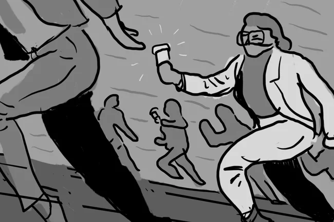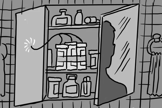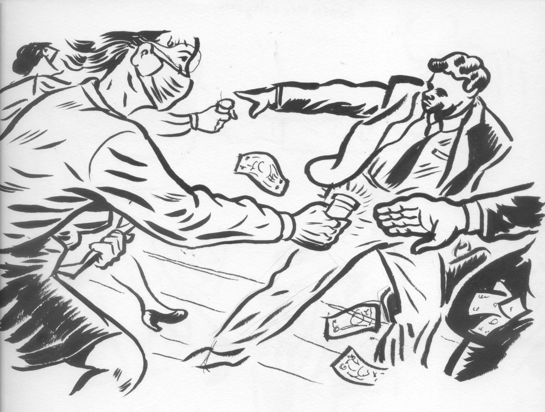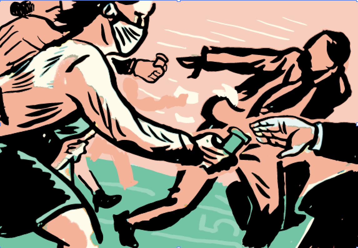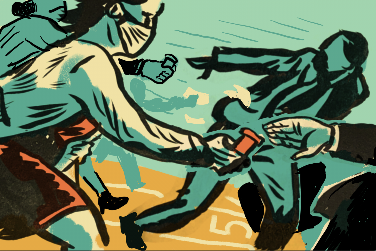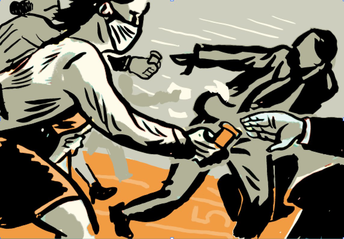 After I did my first pass inking the whole piece, I began coloring the image. Unfortunately the composition suddenly felt unfocused and I needed to make big changes which is a lot harder at this stage. What was the problem? The main focus of the image (the pill bottle handoff) was getting lost, and the man in the background was taking too much attention away from this. Also, look how ugly he is; it's distracting. We need to refocus on the woman and her sweaty brow. I needed to get his face out of frame and make some space around the pill bottle. I also felt like some bursting lines could draw even more attention to the bottle. I added a lot more black around the image to give it weight. What is a successful illustration? To me, it is an image that can direct the eye to the places it needs to go. We need to use every tool necessary to direct the eye towards these spots and away from unimportant details. Below was where I settled after and hour or so of cutting things up and moving them around in photoshop. Here is a sped up video of the 2nd inking pass.