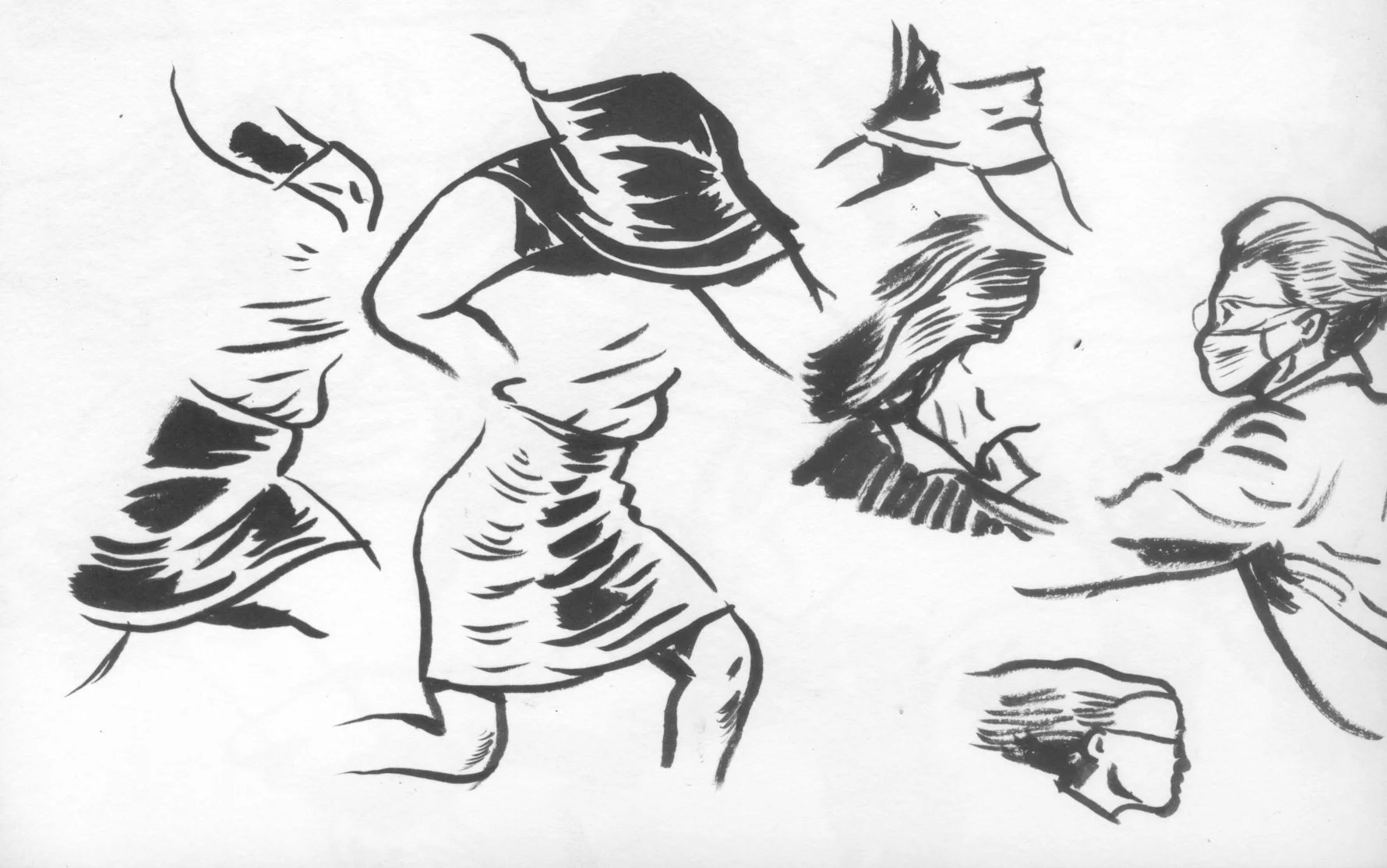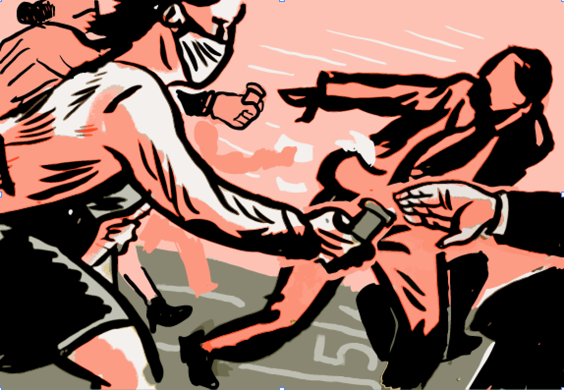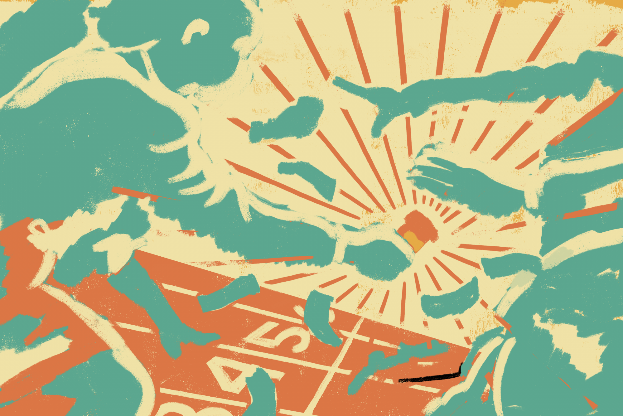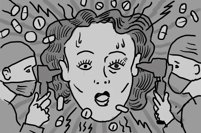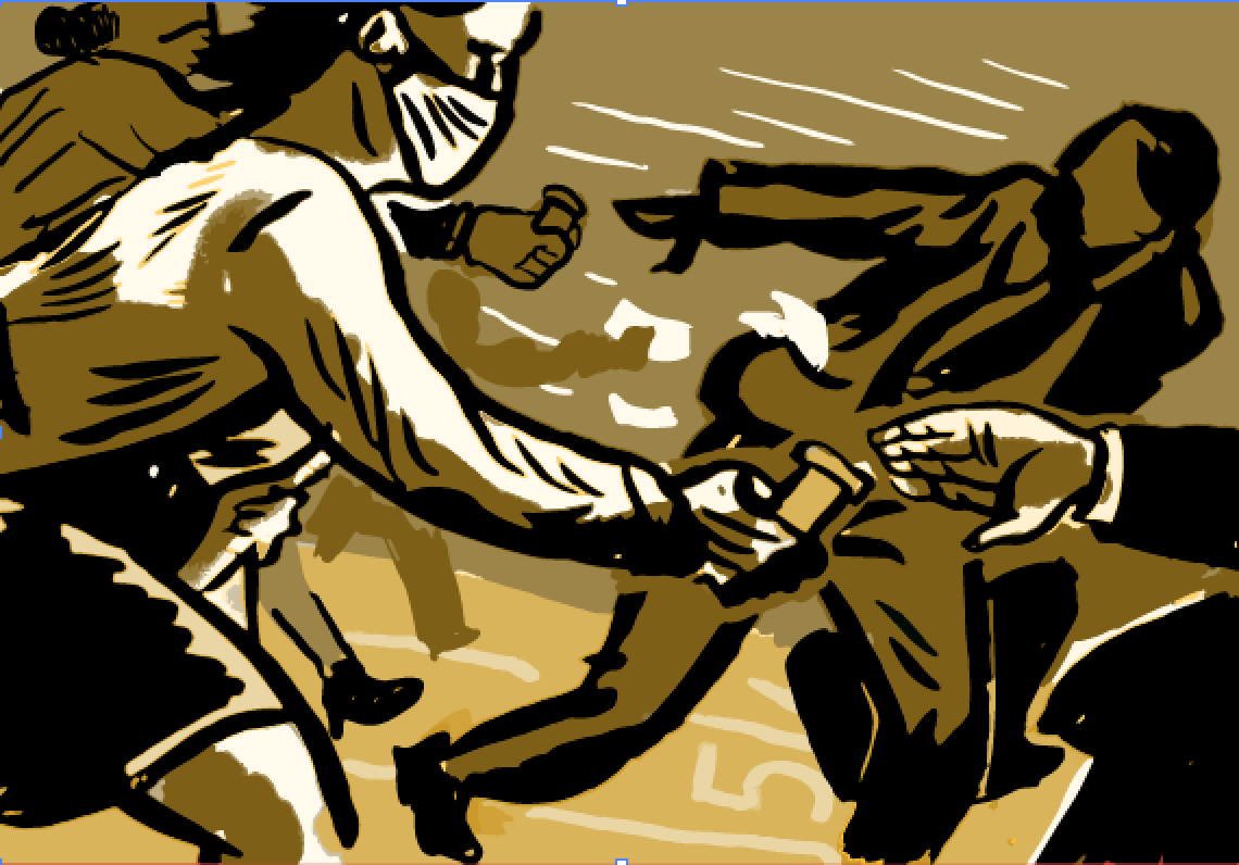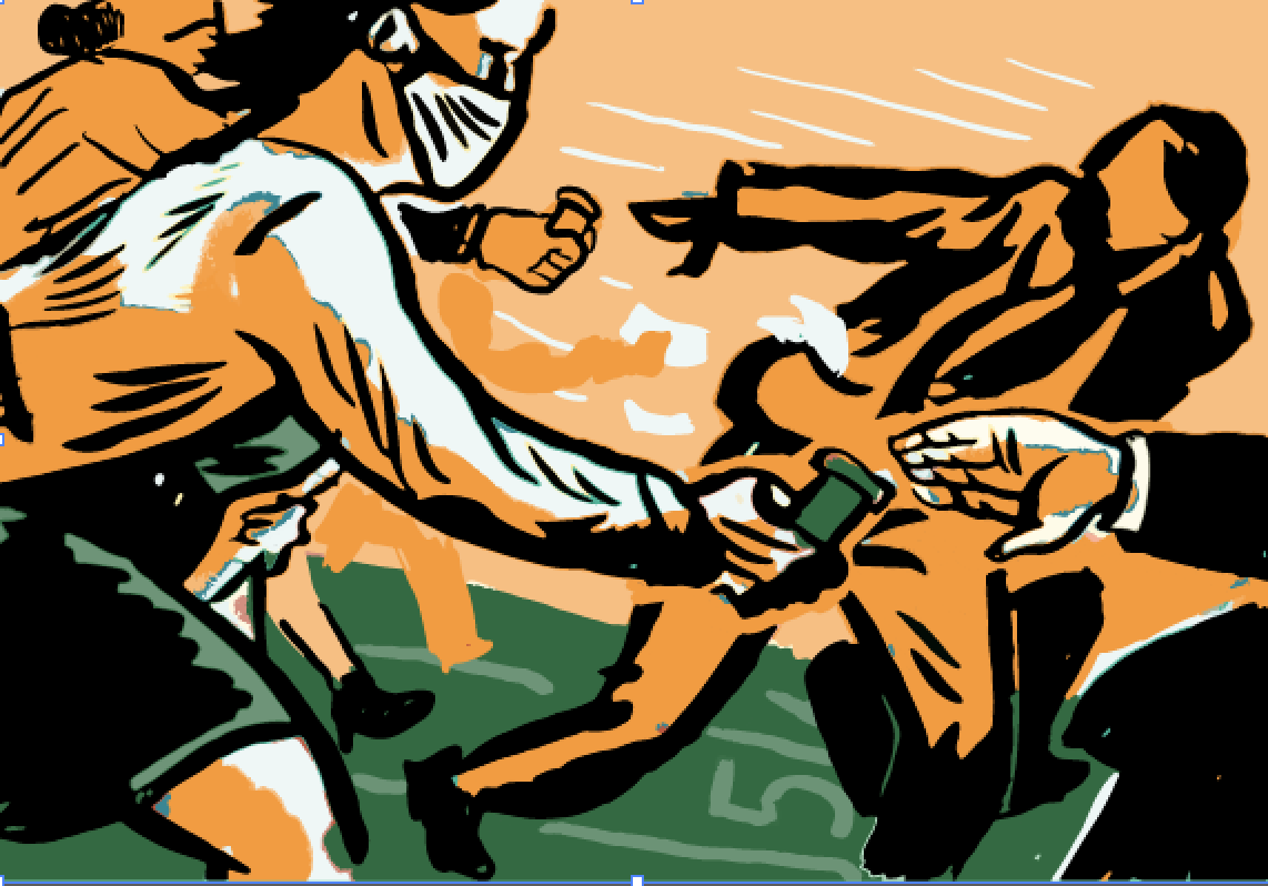 After I did my first pass inking the whole piece, I began coloring the image. Unfortunately the composition suddenly felt unfocused and I needed to make big changes which is a lot harder at this stage. What was the problem? The main focus of the image (the pill bottle handoff) was getting lost, and the man in the background was taking too much attention away from this. Also, look how ugly he is; it's distracting. We need to refocus on the woman and her sweaty brow. I needed to get his face out of frame and make some space around the pill bottle. I also felt like some bursting lines could draw even more attention to the bottle. I added a lot more black around the image to give it weight. What is a successful illustration? To me, it is an image that can direct the eye to the places it needs to go. We need to use every tool necessary to direct the eye towards these spots and away from unimportant details. Below was where I settled after and hour or so of cutting things up and moving them around in photoshop. Here is a sped up video of the 2nd inking pass.