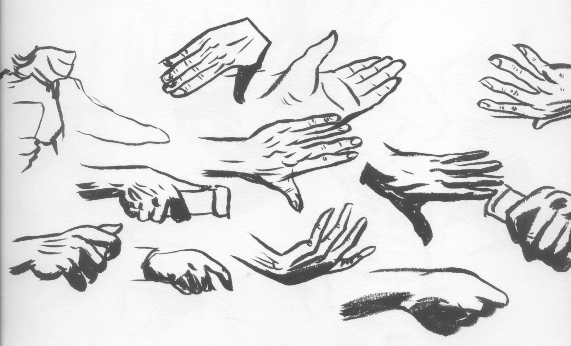 I like to keep the subject matter close up and as large as possible. It's just preference and habit, but it works for impact. After I do pencil studies and I feel confident rendering the subject matter, I like to do some quick ink passes without a pre-sketch. Not looking too much at the references, I will try to do a loose ink version of the whole piece. Sometimes this loose version will bring out something new and interesting. Otherwise, it is time to go to the inking stage.
